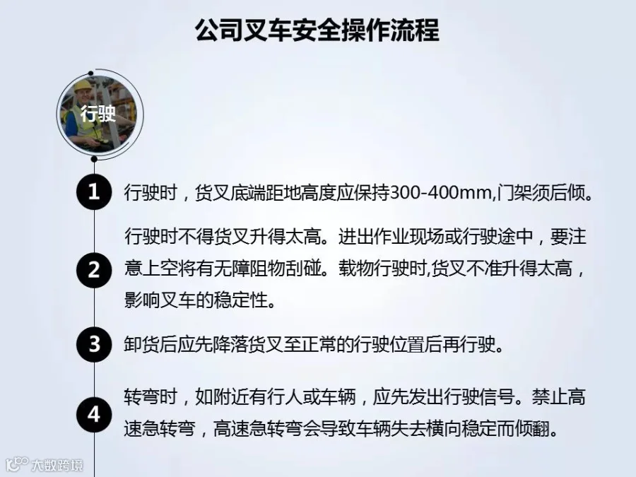 1.行驶时,货叉底端距地高度应保持300-400mm ,门架须后倾。
