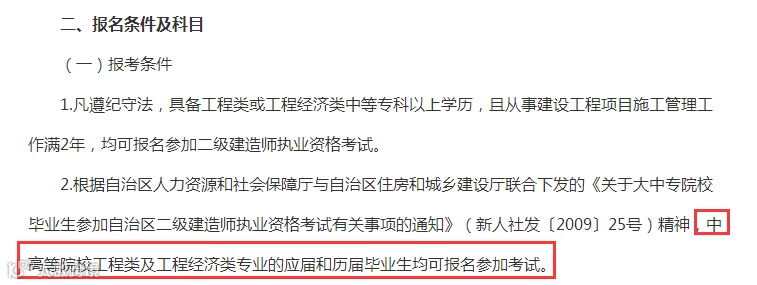 根据自治区人力资源和社会保障厅与自治区住房和城乡建设厅联合下发的《关于大中专院校毕业生参加自治区二级建造师执业资格考试有关事项的通知》(新人社发〔2009〕25号)精神,中高等院校工程类及工程经济类专业的应届和历届毕业生均可报名参加考试。