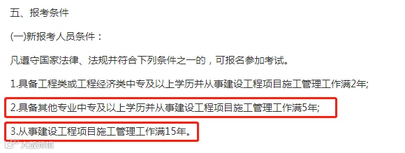 具备工程类或工程经济类大专及以上学历并从事建设工程项目施工管理工作满1年,均可报名。