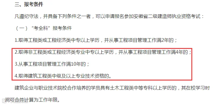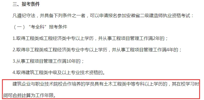 安徽省人事考试网规定:建筑企业与职业技术院校合作培养的学员具有土木工程类中等专科以上学历的,其在校学习时间可合并计算为工作年限。