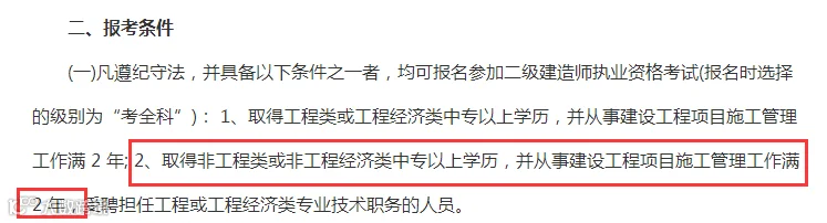工程类或工程经济类中等专科(含职高、技校)学历并从事建设工程项目施工管理工作满2年;