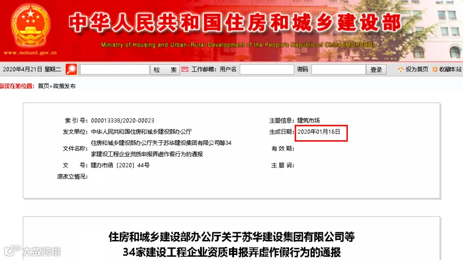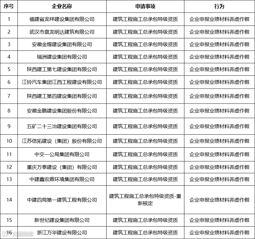 早在今年1月16日,住房和城乡建设部一次性通报34家建企,同样是在资质申报过程中业绩造假。