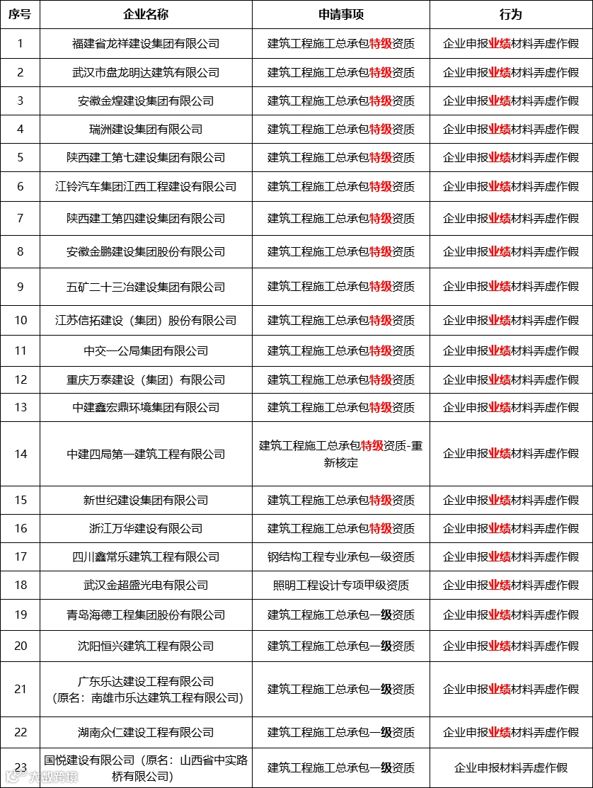 23家建企在资质申报过程中存在申报业绩/材料弄虚作假行为。