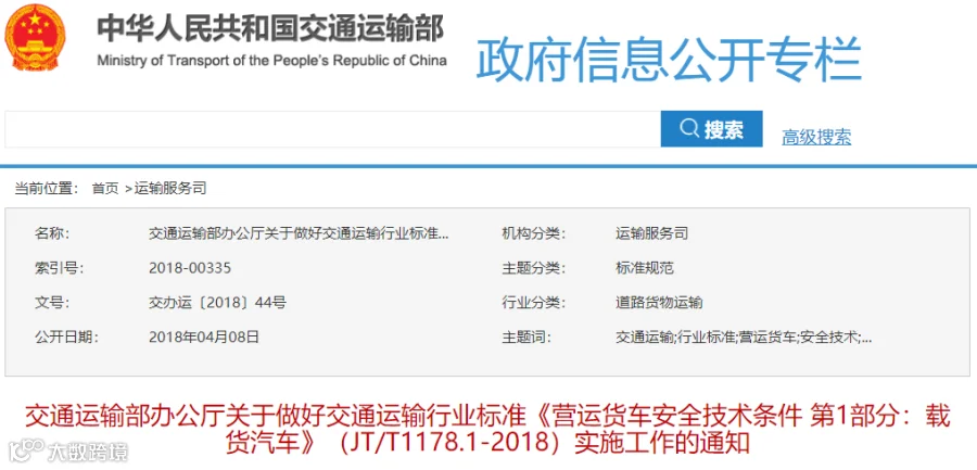 根据交通运输部发布的《营运货车安全技术条件》,从今年9月1日开始,将对载货汽车、牵引车与挂车执行新标准,包含了制动、安全防护、报警等多项配置。