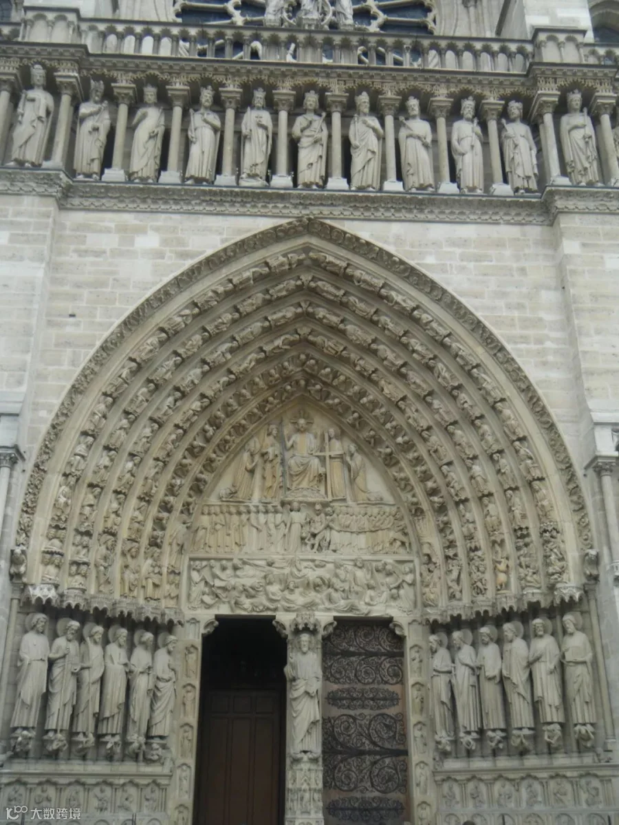 如今这个正面缺少了三样重要的东西。首先是原来把那十一级台阶从地面上加高了;其次是三座拱门神龛里下方的一系列雕像;还有装饰着二楼长廊。神龛上方从前历代二十八位法兰西国王的一系列雕像,从希勒德贝尔起,到手执”皇柄”的菲利浦-奥古斯都。