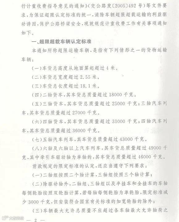 1、对原收费公路计重收费文件中有关超限超载车辆认定标准进行调整,统一采用《超限运输车辆行驶公路管理规定》(交通运输部令2016年第62号)有关认定标准。标准集装箱运输车辆超限超载认定标准也遵照上述规定执行。
