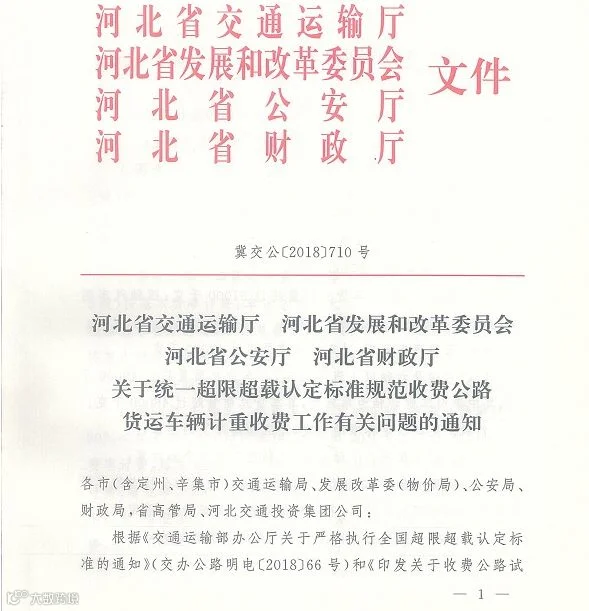 近日,河北省交通运输厅、省发展和改革委员会、省公安厅、省财政厅四部门联合印发《关于统一超限超载认定标准规范收费公路货运车辆计重收费工作有关问题的通知》(简称《通知》。
