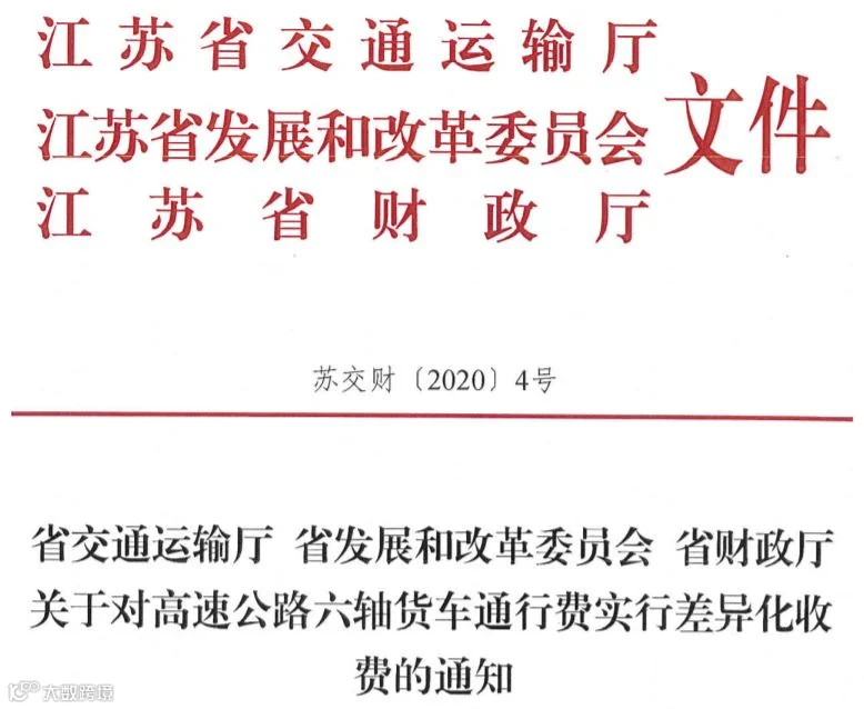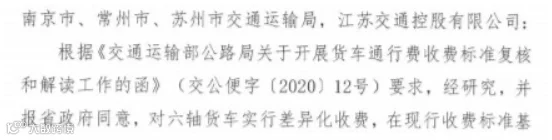 1月13日,江苏省运输厅、发改委、财政厅联合发布,对六轴货车通行费实行差异化收费,在现收费基础上实施