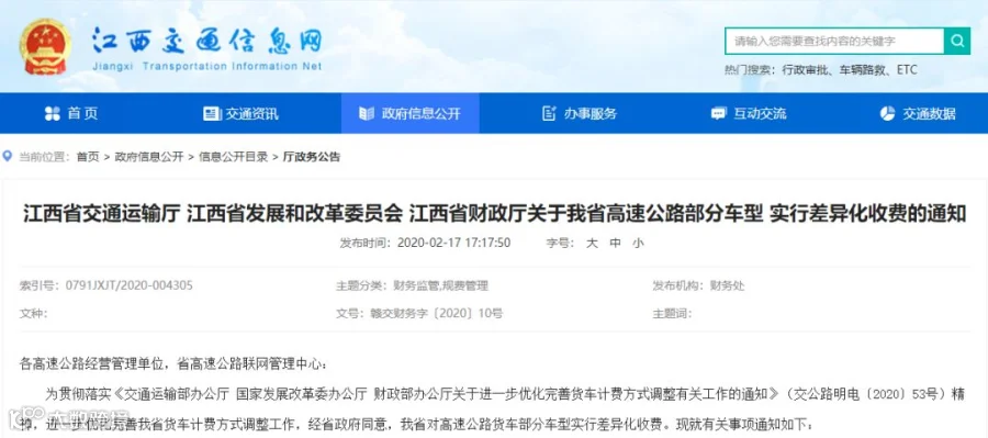 江西省交通运输厅等三部门发布《关于我省高速公路部分车型 实行差异化收费的通知》,对2类至6类货车实行差异化收费。