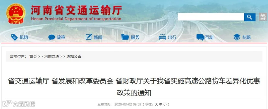 3月2日,河南发布新规定,在疫情结束后,将对货车给予通行费优惠。
