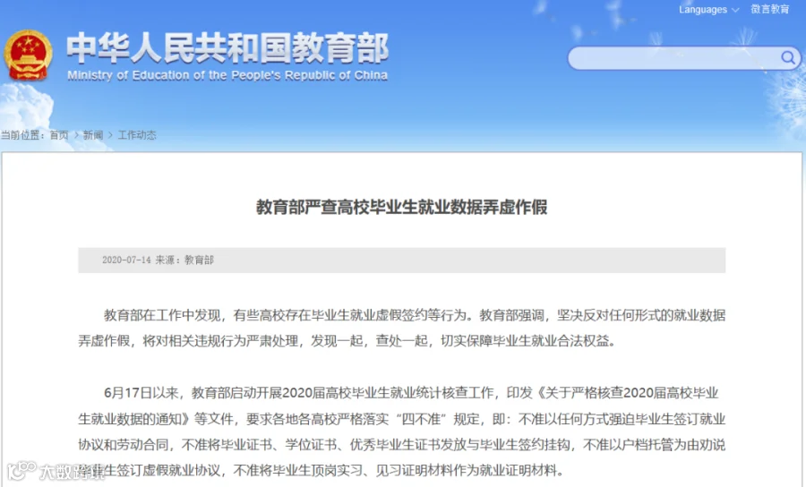 6月17日以来,教育部启动开展2020届高校毕业生就业统计核查工作,印发《关于严格核查2020届高校毕业生就业数据的通知》等文件,要求各地各高校严格落实“四不准”规定,即:不准以任何方式强迫毕业生签订就业协议和劳动合同,不准将毕业证书、学位证书、优秀毕业生证书发放与毕业生签约挂钩,不准以户档托管为由劝说毕业生签订虚假就业协议,不准将毕业生顶岗实习、见习证明材料作为就业证明材料。