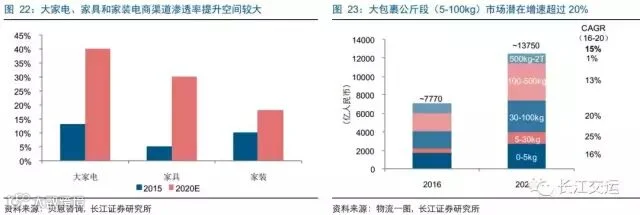 根据中国物流采购联合会的信息,中国大件物流2015年的市场规模近9000亿元,2015年B2C电商大件物流总费用1206亿元,年复合增长率超过65%。现阶段大件商品的电商渗透率仍然较低,随着未来渗透率的进一步提升,大件快递市场未来成长空间值得期待。