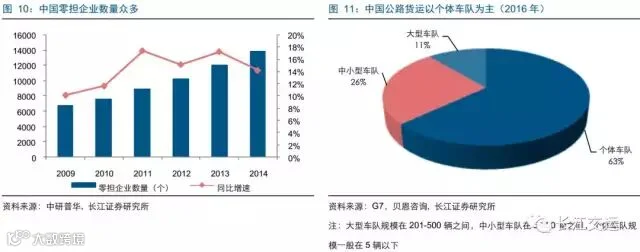 中国零担企业数量众多,但大多以个体车队形式的专线公司为主(2016年占比约63%),规模以上的大车队占比仅有11%。较低的进入门槛使得行业集中度难以大幅提升,零担行业前5家企业收入合计占行业比重仅约3%,行业处于完全竞争市场阶段。