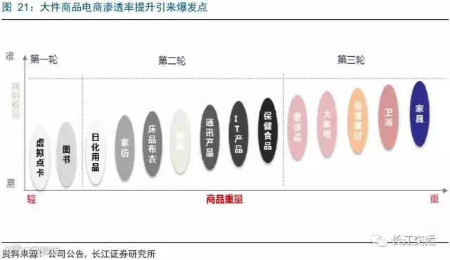 大件商品电商渗透率提升刺激大件快递需求。网购品类丰富度的提升带动大件商品(大家电、家具、建材、运动器材和卫浴等)电商渗透率的提升,并刺激大件商品物流需求的发展。