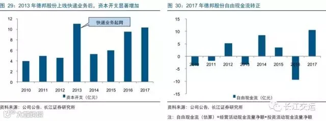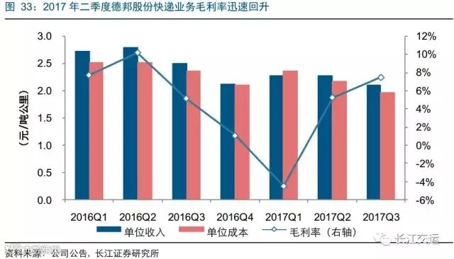 自2013年上线快递业务以来,公司在分拨、运输及末端环节加大建设投入,平均每年资本支出超过8亿元。经过了5年左右的培育期,公司快递业务量规模迅速扩大,2017年日均单量已接近75万票,规模效应初步形成。快递业务毛利率2016年由负转正,2017年已达到5.45%,基本实现稳定的盈利,开始进入收获期。