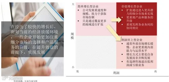 在经历了较快的增长后,面对当前的经济放缓环境,一些企业开始更加注重细分市场的选择和产品服务的升级,在提升效益的前提下,实现发展。一些已经有一定规模的企业从自身发展的角度,将会从简单的规模增长转变为价值增长,步入“做大做强”的合理增长轨迹 (如图6所示)。还有一些企业会选择性的退出低利润和亏损业务,更关注企业效益。