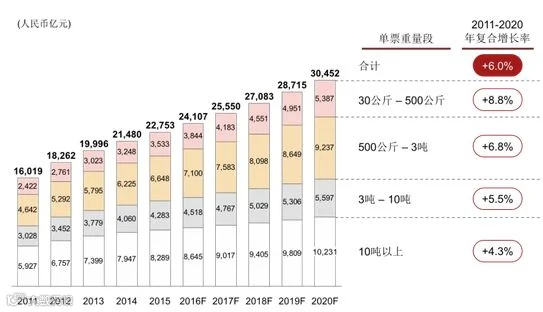 中国公路货运市场的规模达到2.27万亿元,年增长率约为6%,到2020年将达到3.05万亿元, (如图1所示)