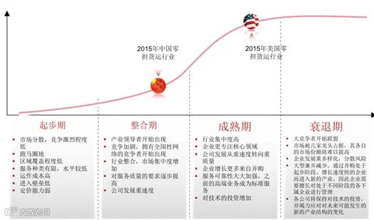 受宏观经济增长放缓影响,零担货运市场整体增长放缓,但行业龙头和诸强仍保持较快增长。2015年,行业前30强平均增长8.9%。相对美国市场,中国零担市场处于较快增长期 (如图4所示)。