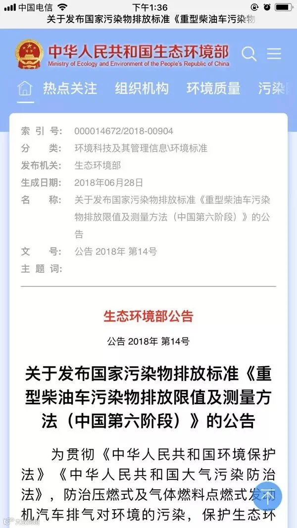 近日,国家生态环境部与国家市场监督管理总局联合下发《重型柴油车污染物排放限值及测量方法(中国第六阶段)》公告。