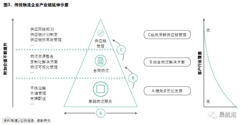 第一类是物流核心业务的从业者,它们专注在各个环节进行着物流行业的价值创造,或是履约仓、干、配的基础物流服务本身,或是作为合同物流商,为目标企业发挥着从供应,生产到分销的“物流总包”职能,再或则是深入客户企业的经营,充当着后者的供应链管理者角色。