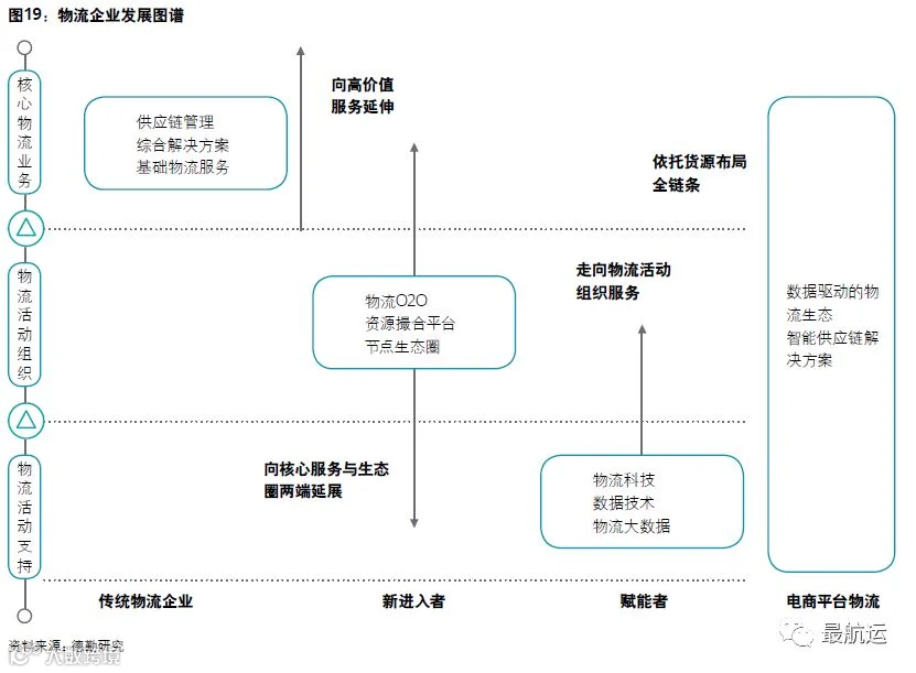 • 科技与数据企业专注于物流活动支持,是行业的赋能者,持续支持行业的智能化发展。这类企业未来将依靠数据连接与沉淀向物流组织活动服务深度延伸。深化大数据分析挖掘技术,构建差异化的科技/数据产品与解决方案是这类行业的立身之本。