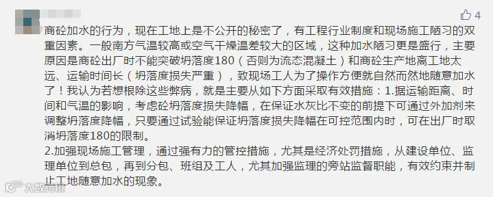 (2)现场加水,从现在施工实际出发,退回搅拌站毕竟是下策,实际上大多时候都是现场处理。尤其是夏天水分流失较大,本身是可以加水的,但是施工现场管理人员及工人无法掌握这个分寸,所以严禁现场私自加水搅拌。