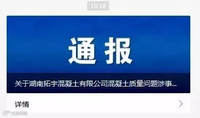 2019年11月9日,长沙市住房和城乡建设局就湖南拓宇混凝土有限公司混凝土质量问题的情况进行了通报,现将尚未公布现场检测核查结果的37个项目情况通报如下: