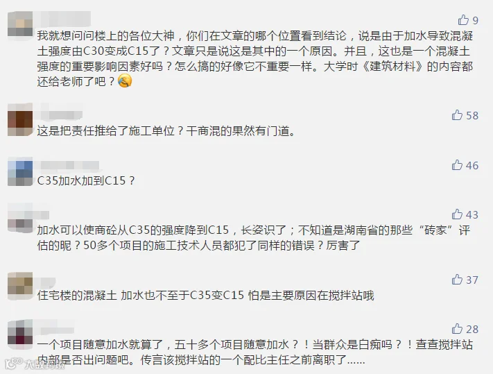 根据专家调查已形成初步意见:在混凝土生产过程中未严格按国家标准规范要求进行质量控制,施工单位在浇筑过程中有随意加水现象。公安机关已控制涉事搅拌站法人,启动立案调查。