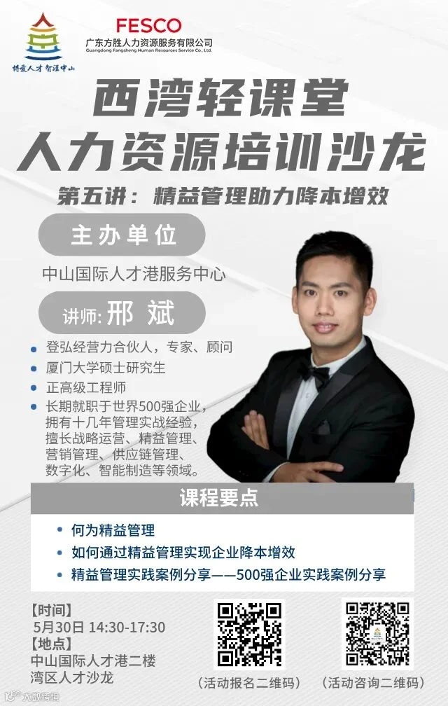 FESCO广东方胜将以合作方身份大力支持中山人才港“西湾轻课堂”活动,并成功邀请到拥有世界500强企业管理实战经验的邢斌老师,他将以“精益管理”为主题开展培训,结合案例分析及现场答疑,使学员能直观、系统地掌握相关知识要点,助力企业降本增效。