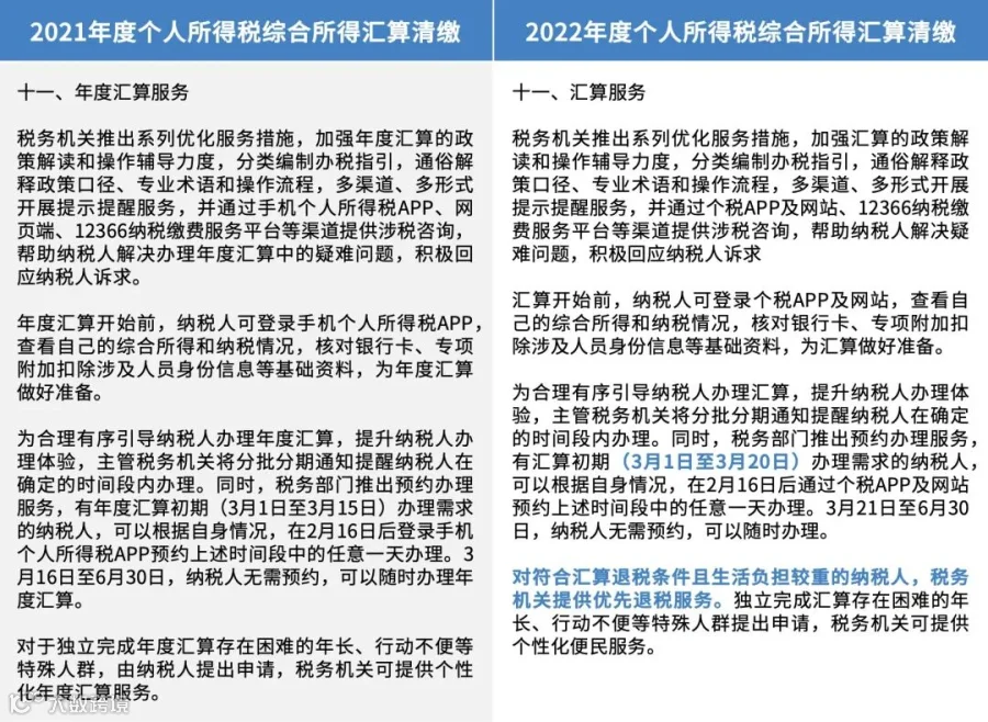 在第十一条“汇算服务”部分,进一步完善了预约办税制度,在维持预约办税起始时间(2月16日)基础上,将预约结束时间延长至3月20日,为纳税人提供更优的办理体验。