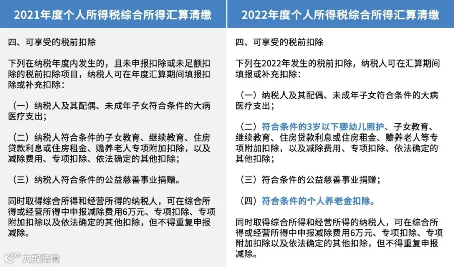 在第四条“可享受的税前扣除”部分,根据《国务院关于设立3岁以下婴幼儿照护个人所得税专项附加扣除的通知》(国发〔2022〕8号)、《财政部 税务总局关于个人养老金有关个人所得税政策的公告》(2022年第34号)规定,增加了3岁以下婴幼儿照护专项附加扣除、个人养老金等可以在汇算中予以扣除的规定。