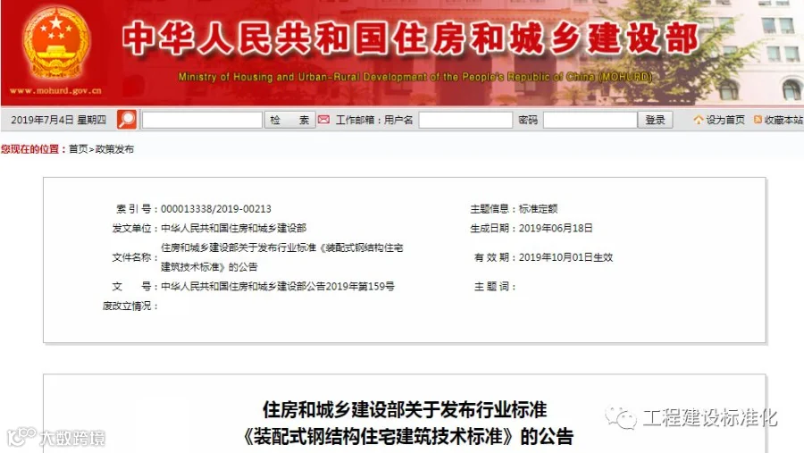 现批准《装配式钢结构住宅建筑技术标准》为行业标准,编号为JGJ/T469-2019,自2019年10月1日起实施。