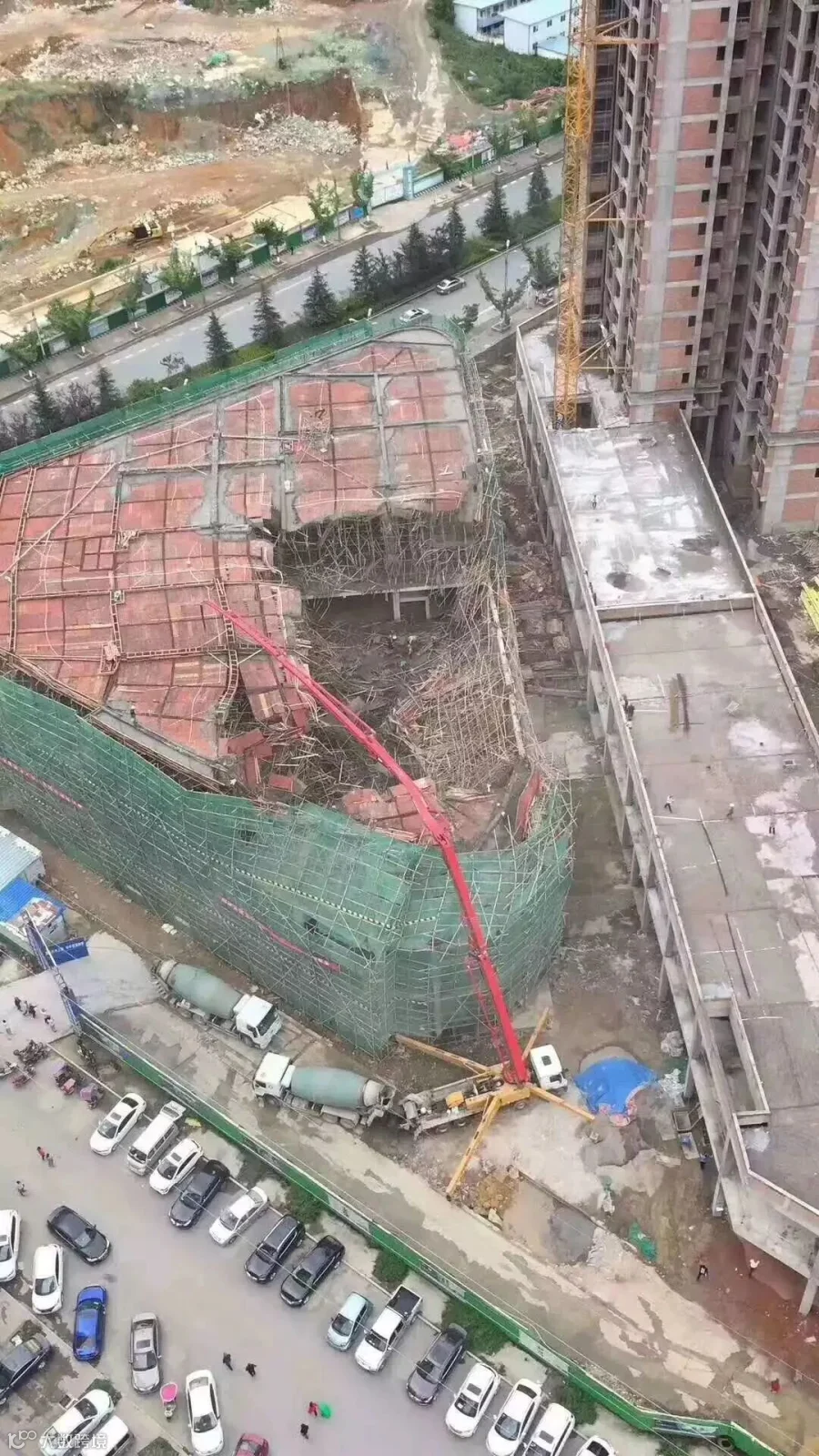 央视网消息:6月9日上午11点40分左右,七星关区碧阳街道一施工工地发生支架垮塌。从附近群众拍摄的画面中可以看到,该工地因塌陷出现一个大坑,大量脚手架倒塌在中间。