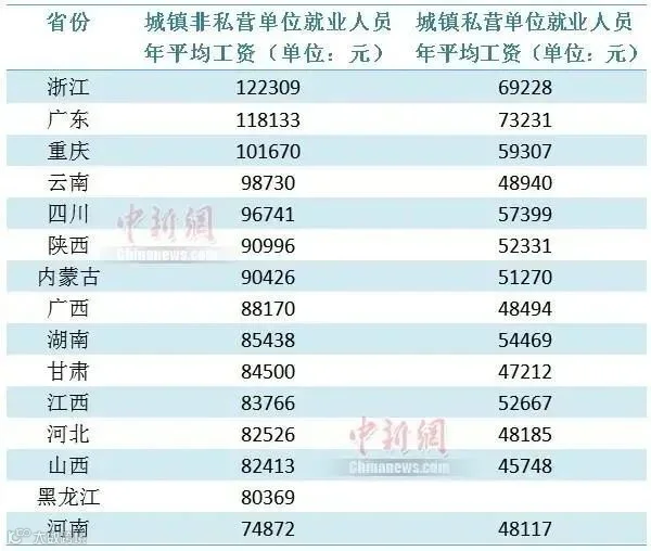 在这15个省份中,浙江、广东、重庆的城镇非私营单位就业人员年平均工资超过10万元大关。