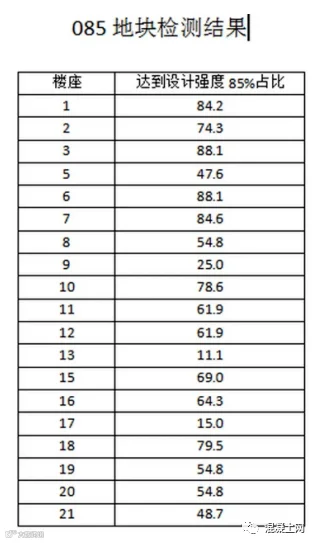 据此前山东电视台齐鲁频道报道,由山东省建筑工程质量检验检测中心出具的检测报告显示,被重建的三栋楼主体结构混凝土强度推定值达到设计强度85%的检测批占比分别为25%、11.1%、15%,其余楼座仅为47%到80%不等。对此,新京报邀请了专家解读,认为混凝土是原材料存在质量问题,可能对房屋构件产生危害。