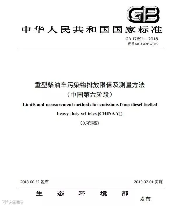 国家生态环境部与国家市场监督管理总局联合下发《重型柴油车污染物排放限值及测量方法(中国第六阶段)》公告。