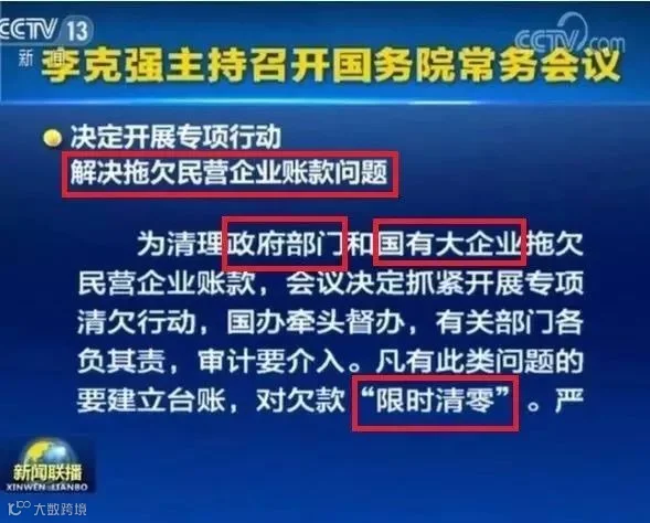11月9日,国常会决定抓紧开展专项清欠行动,解决拖欠民营企业账款问题。并明确要求,凡有拖欠问题的都要建立台账,对欠款“限时清零”。