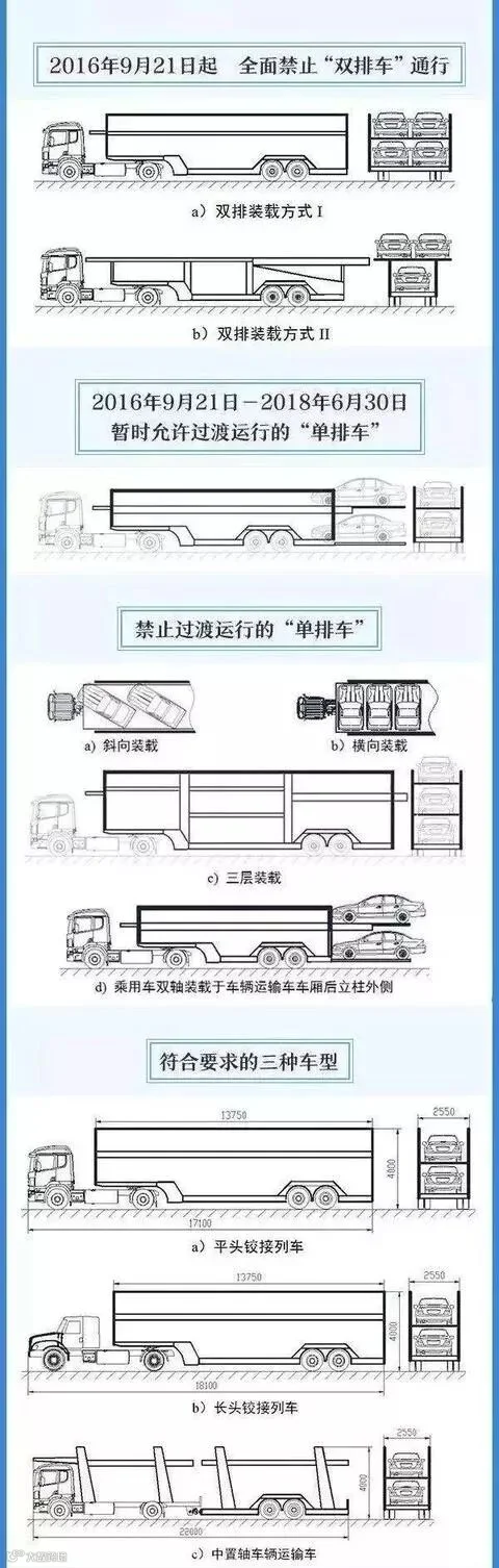 2018年7月1日起,全面禁止不合规车辆运输车通行,符合《汽车、挂车及汽车列车外廓尺寸、轴荷及质量限值》(GB1589-2016)要求的标准化车辆运输车比重达到100%,中置轴车辆运输列车等先进车型得到广泛应用。