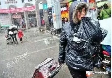 火车站前,外面下着大雪。