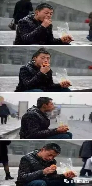 他坐在台阶上吃着面包,吃了一口,再也吃不下,他忍不住哭了。