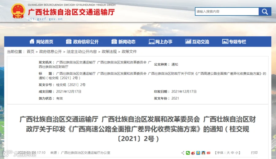 广西高速公路全面推广差异化收费实施方案》(以下简称《方案》)将于2022年1月1日起,到2023年12月31日止。全面实施,时间暂定2年。
