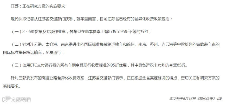 为减少社会公众通行费用支出、服务公众便捷高效通行,促进物流降本增效,日前,黑龙江省交通运输厅、发展和改革委员会、财政厅联合印发了《黑龙江省高速公路差异化收费实施方案》,2021年11月1日起执行,试行期1年。