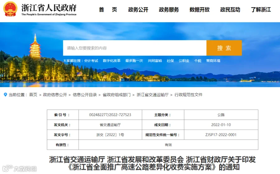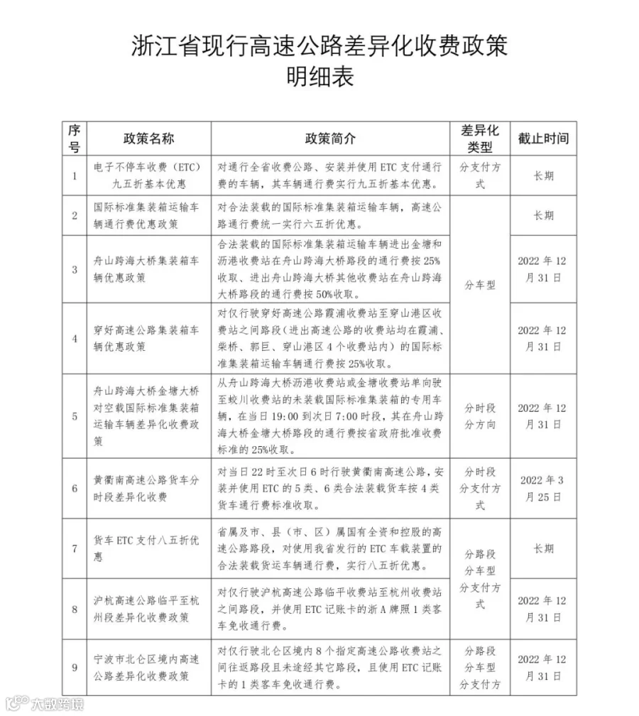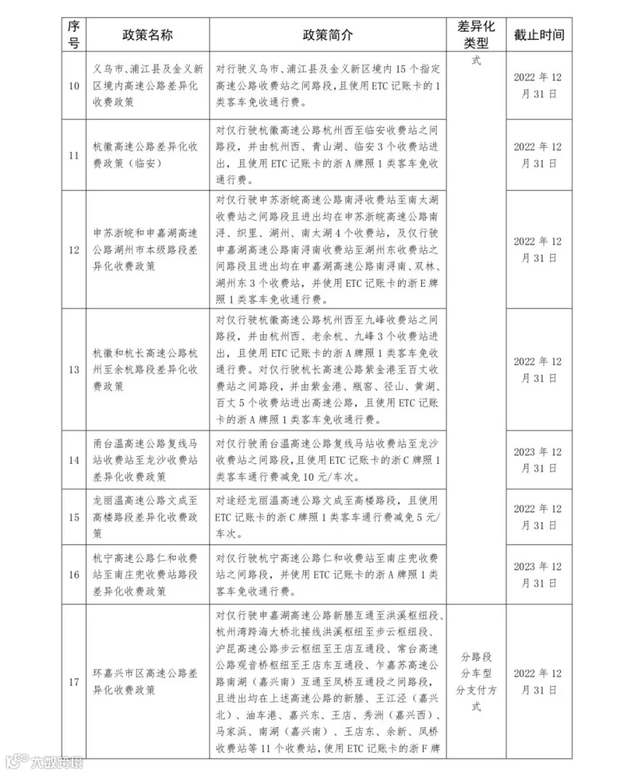 为规范有序推进浙江省高速公路差异化收费工作,进一步提升高速公路通行效率和服务水平,促进物流降本增效,(一)继续实施现有差异化收费政策。(二)积极开拓差异化收费项目。结合浙江省高速公路网运行实际,重点推进与改扩建高速公路平行路段、交通量明显低于设计能力路段、普通国省干线公路或城市道路拥堵严重但平行高速公路交通流量较小路段等高速公路的差异化收费工作,合理选择分路段、分车型(类)、分时段、分出入口、分方向、分支付方式等灵活组合的高速公路差异化收费方式,稳步推进我省高速公路差异化收费工作。(实施要点详见附件)。(三)探索建立差异化收费政策动态调整机制。