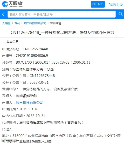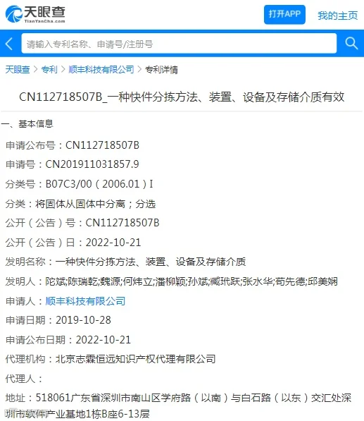10月21日消息,天眼查信息显示,今日,顺丰科技有限公司一项“一种快件分拣方法、装置、设备及存储介质”专利获授权,授权公告号CN112718507B,申请日期为2019年10月8日。