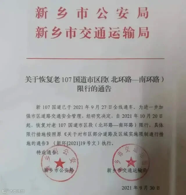 自2021年10月20日起,新乡将对老107国道平原示范区段实施货车限制通行措施: