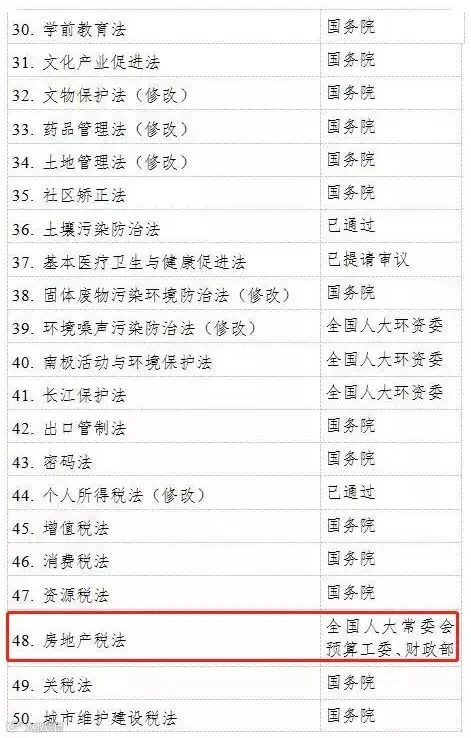 4月27日,全国人大常委会公布2018年立法工作计划,房地产税法被列为预备审议项目,视情在2018年或者以后年度安排审议。