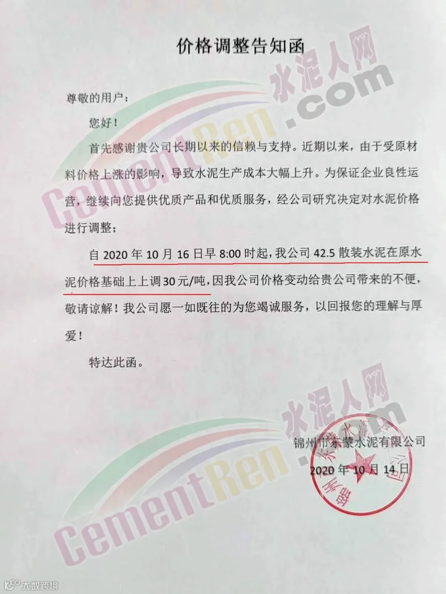 锦州东蒙水泥通知受原材料价格上涨影响,导致水泥生产成本大幅上升,经公司研究决定自10月16日早8时起公司42.5级散装水泥在原价基础上上调30元/吨。