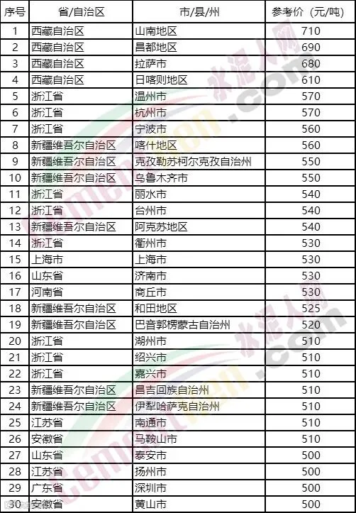 华东上海市、安徽省黄山、浙江温州市、杭州市、宁波市、丽水市、台州市、衢州市、湖州市、绍兴市、嘉兴市9个城市区域,山东省济南市、泰安市、江苏南通市、扬州市、河南商丘市、安徽马鞍山市、黄山市、广东深圳市30余个省市地区水泥价格突破500元/吨大关,直逼600元/吨。