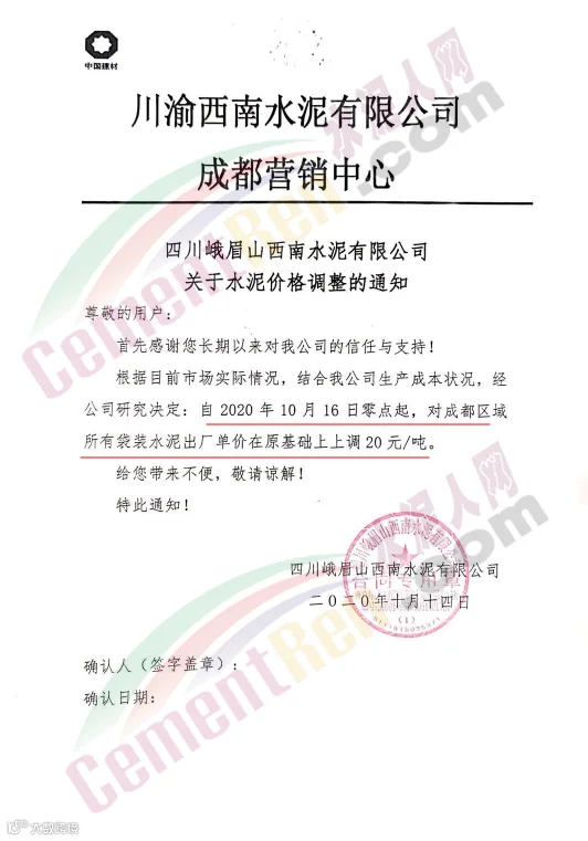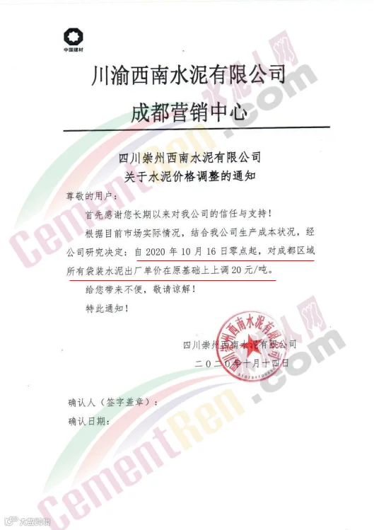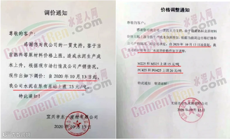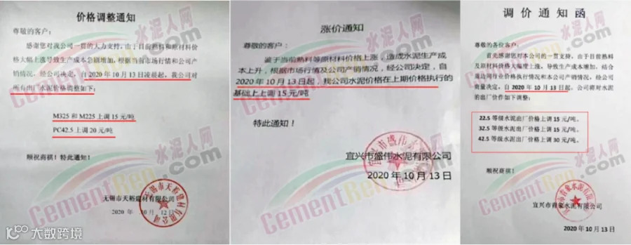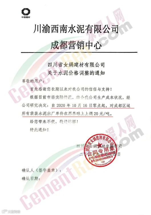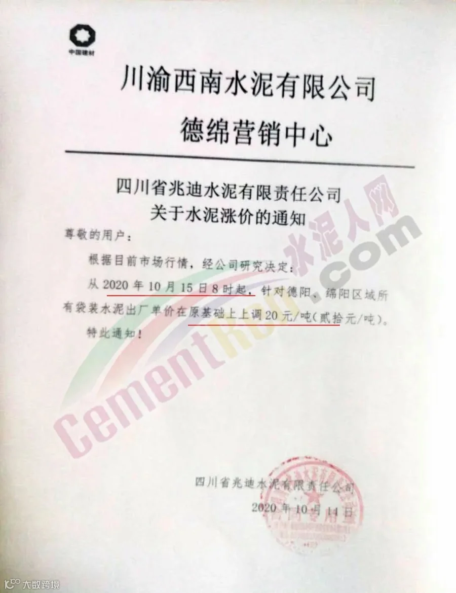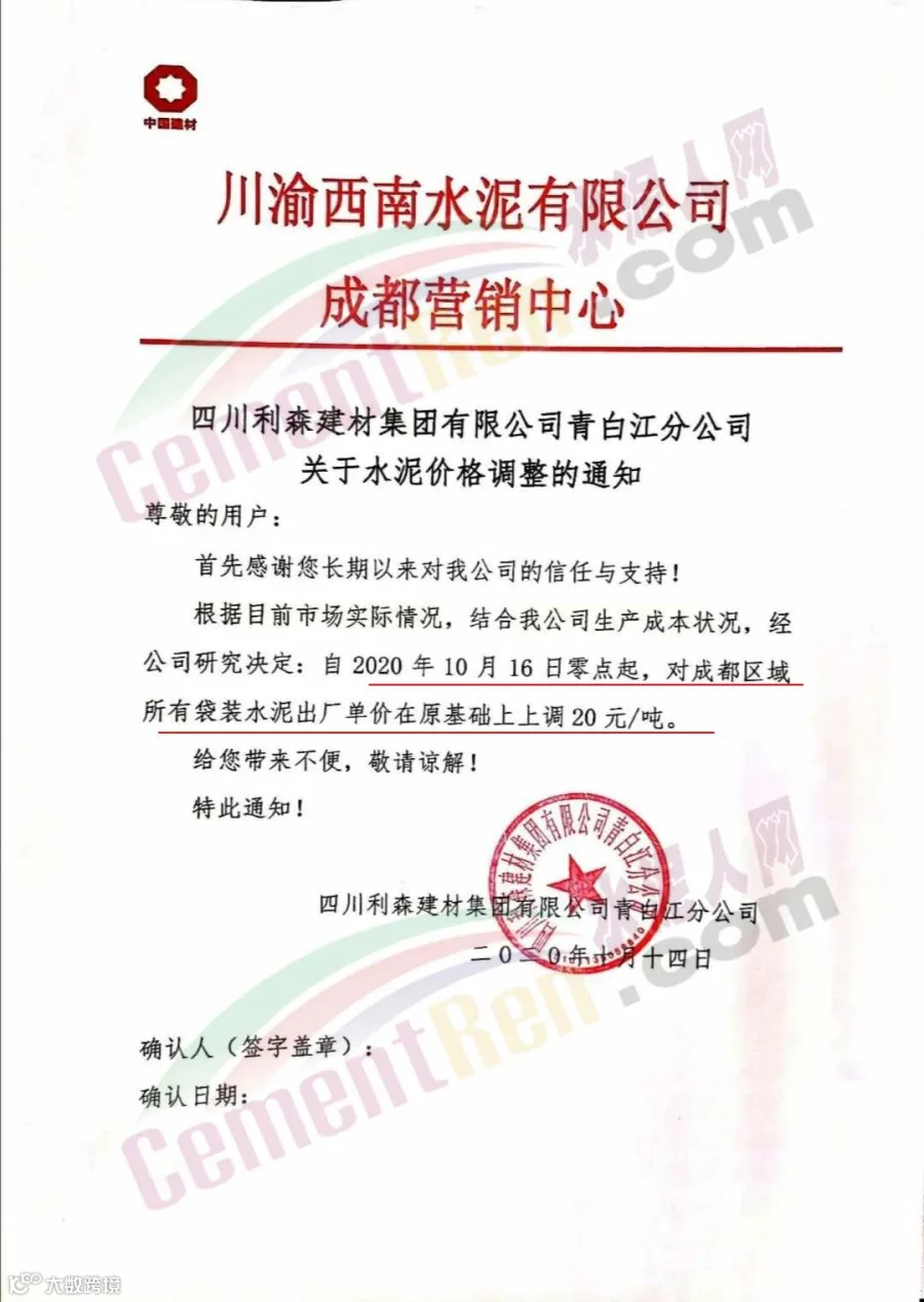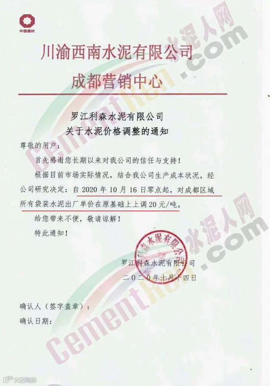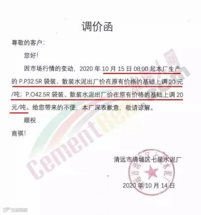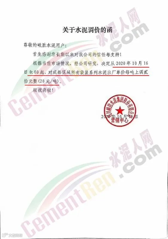 长治华润通知,10月16日零点起调整水泥价格,32.5水泥上调40元/吨,42.5包装水泥上调60元/吨。