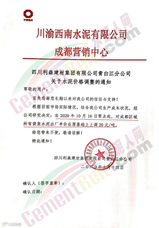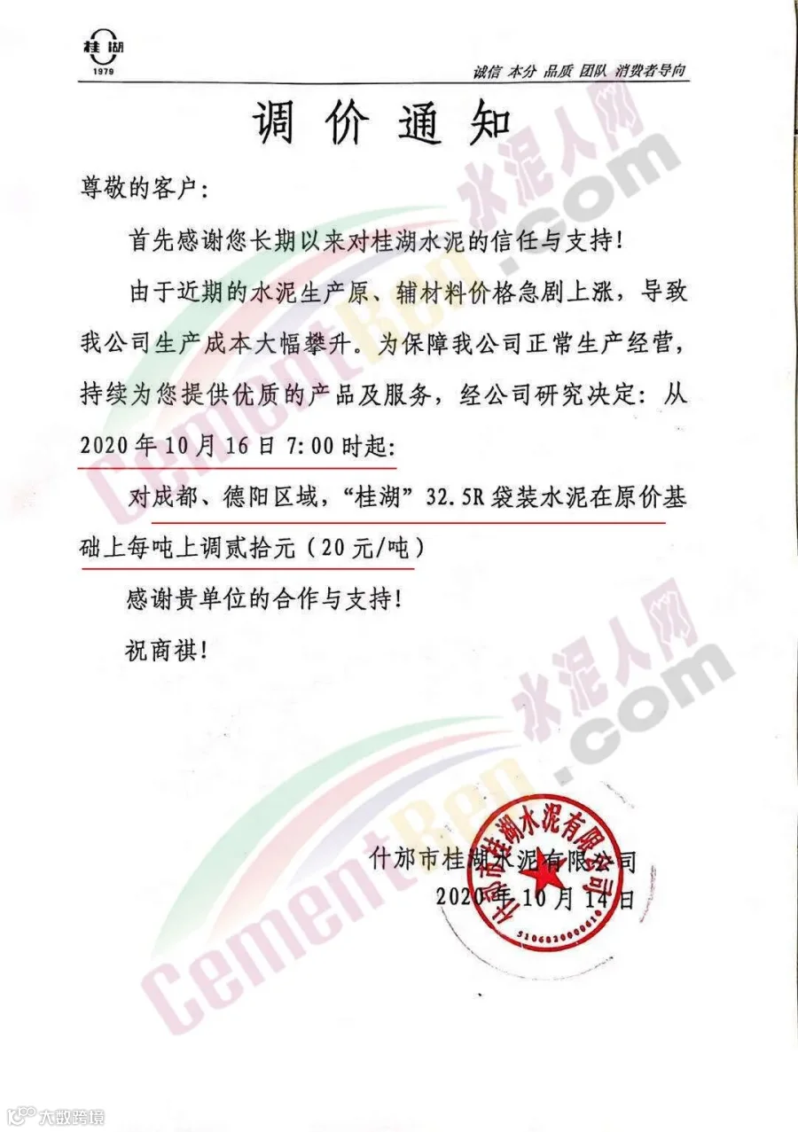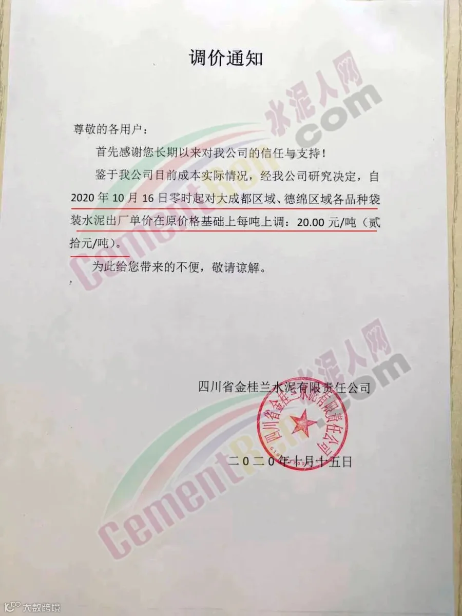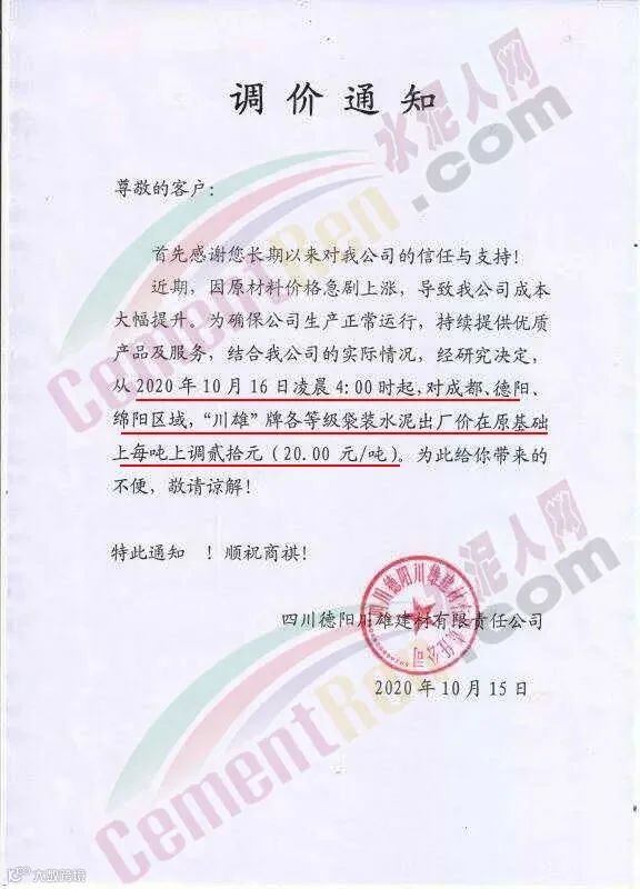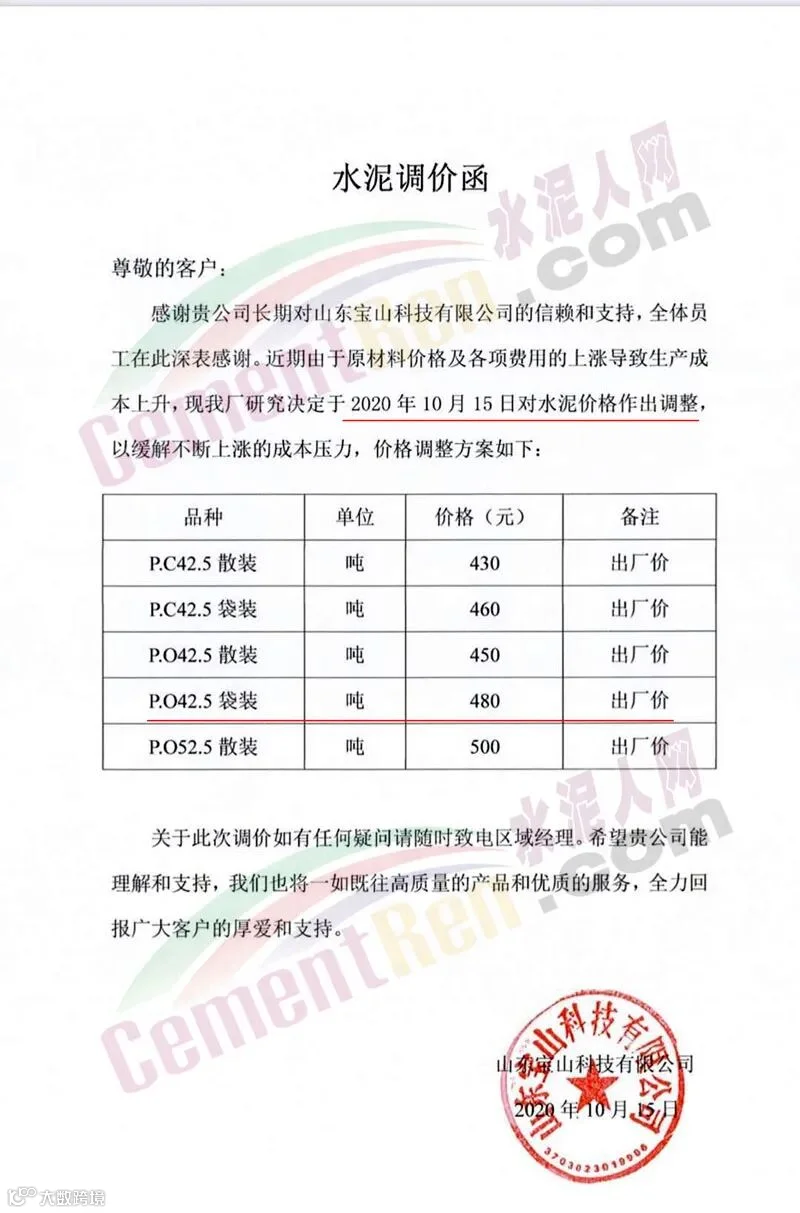 15日,山东宝山科技通知由于原材料价格及各荐费用的上涨导致生产成本上升,经研究决定于10月15日对水泥价作出调整以缓解不断上涨的成本压力。